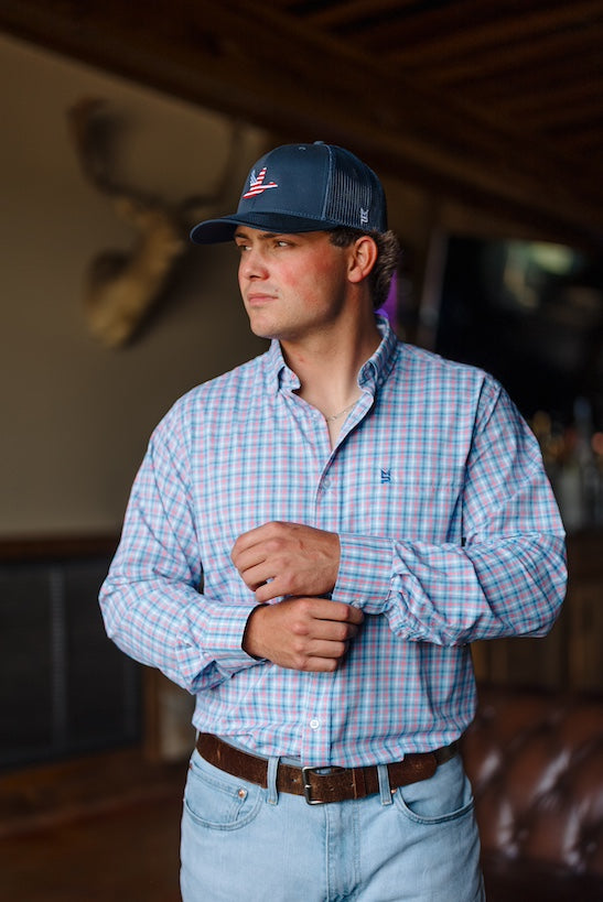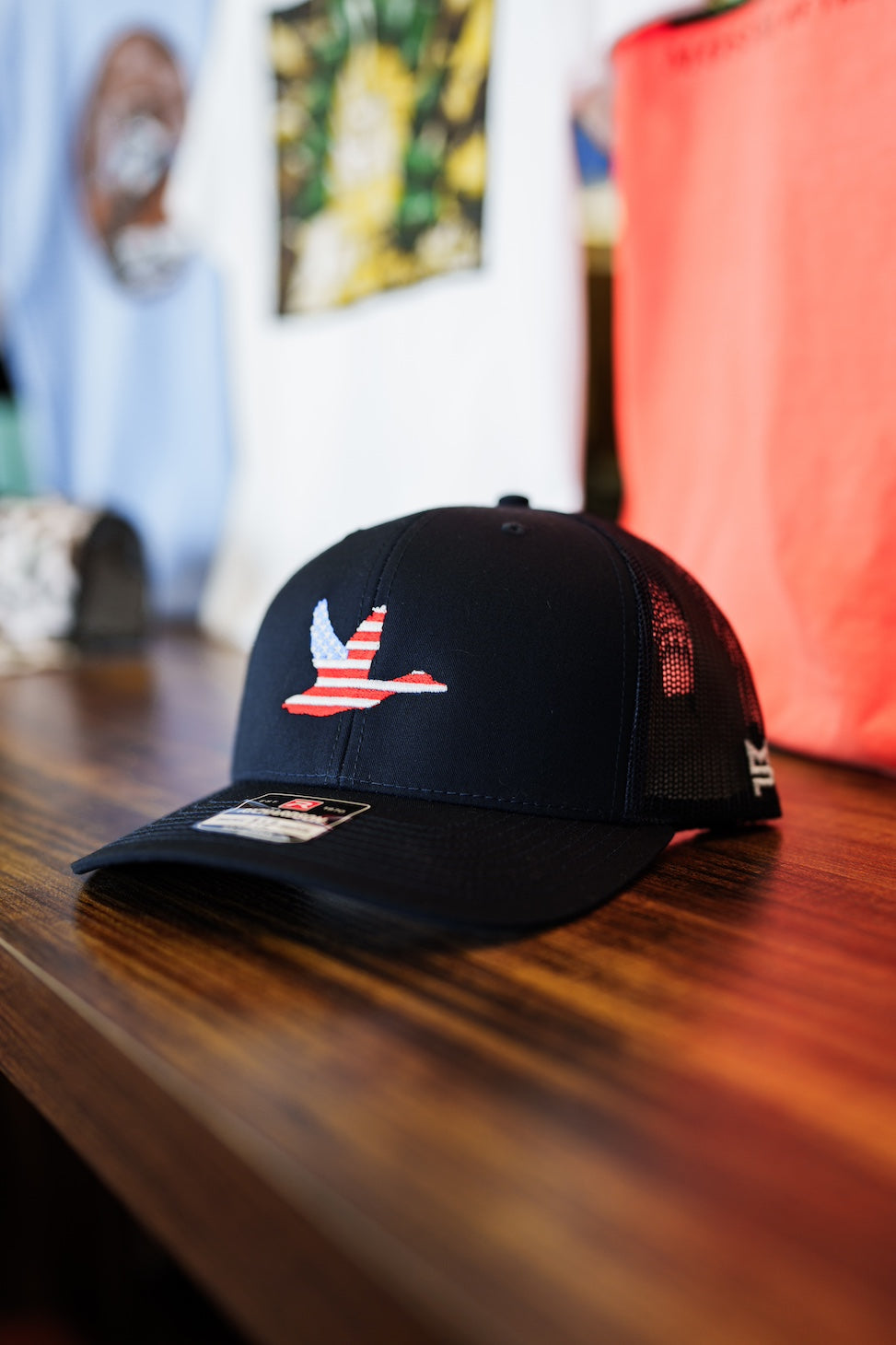 Richardson 112 Navy with embroidered American Flag duck on front and MP logo on side