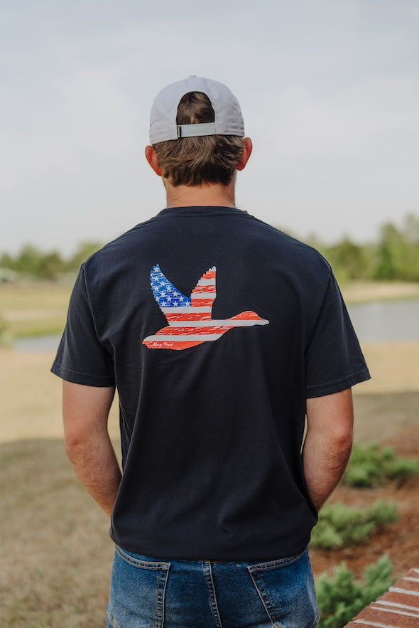 Black Comfort Colors t-shirt with white MP logo on front and red, white and blue American Flag duck on the back.