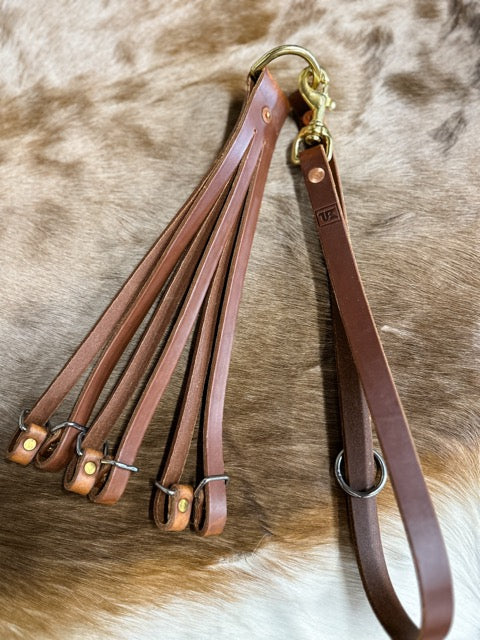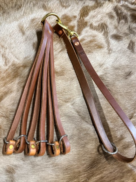 Embossed with our MP logo, this western style leather duck tote is equipped with a 27” long harness leather strap 5/8” wide with a solid brass scissor snap and a stainless steel ring making it ideal for wading in timber and this makes it one of the best leather game straps available. This leather duck strap can be securely attached around a tree and held in position by fastening the scissor snap to the stainless ring. The "Cowboy" leather duck tote is equipped with a 1 ½” solid brass D-ring and has six hangers with stainless steel loops fastened with solid brass rivets and a solid copper rivet. When the hunt is over you can easily attach the scissor snap to the D-ring and walk out with your limit on your shoulder.